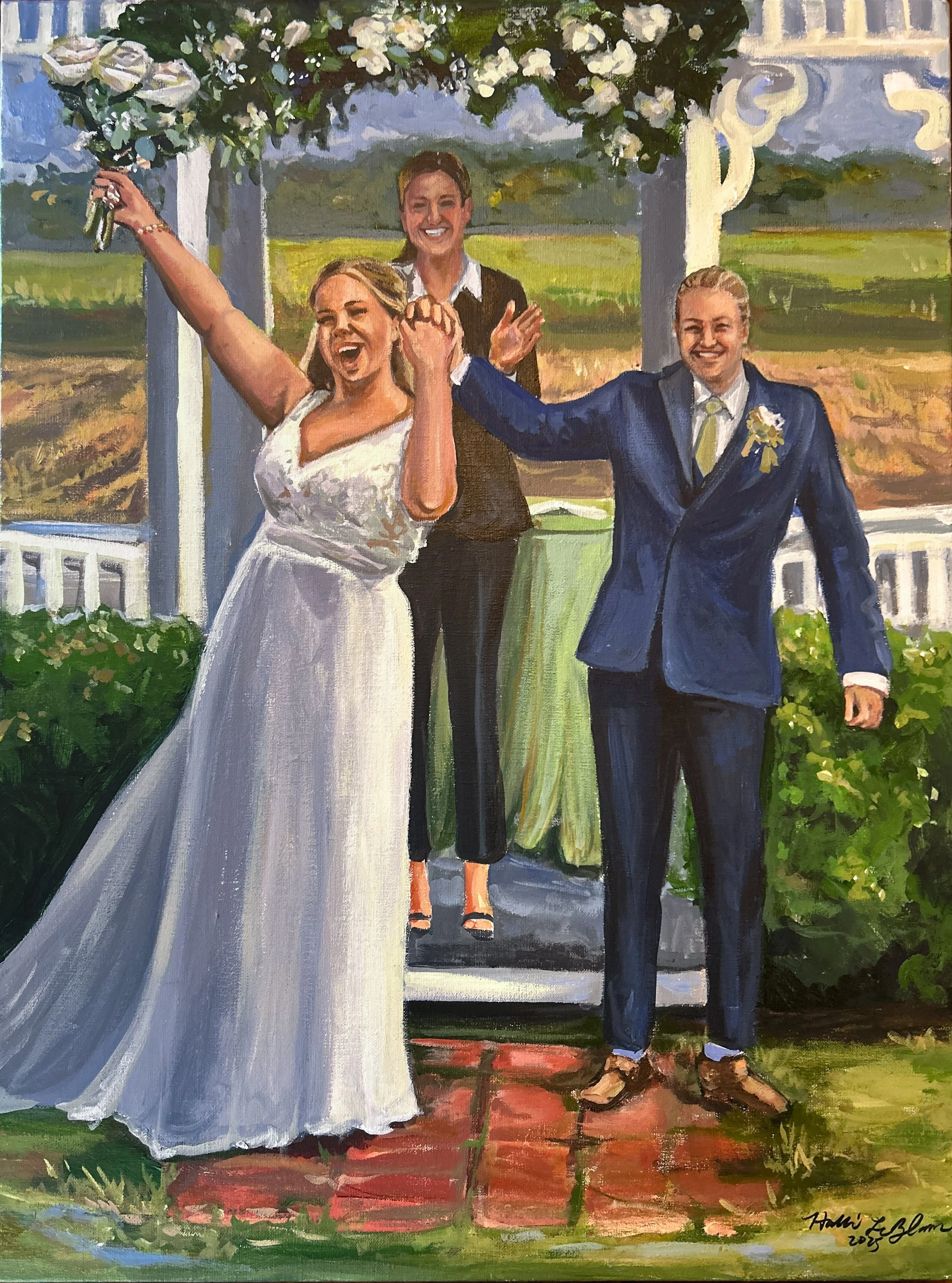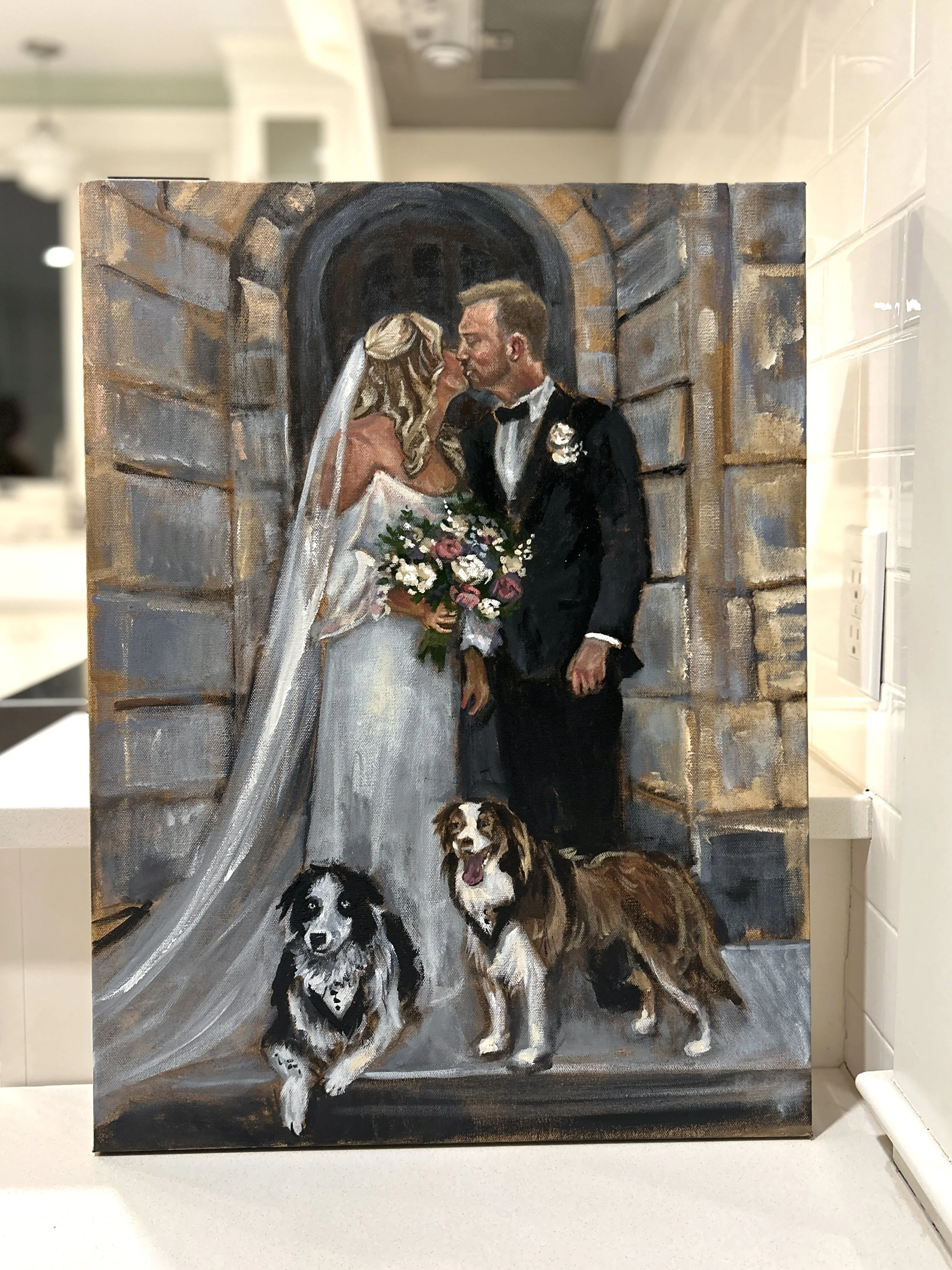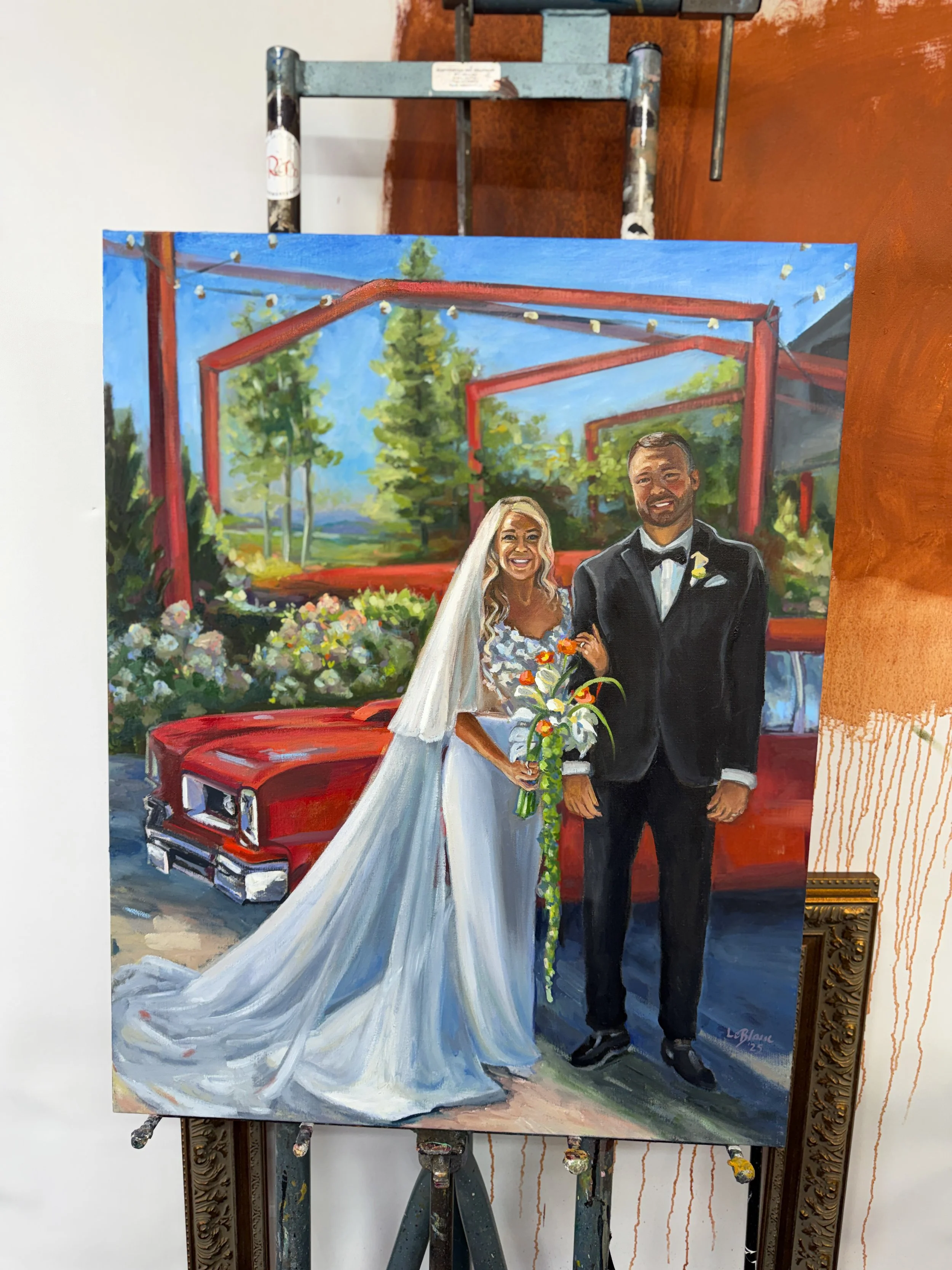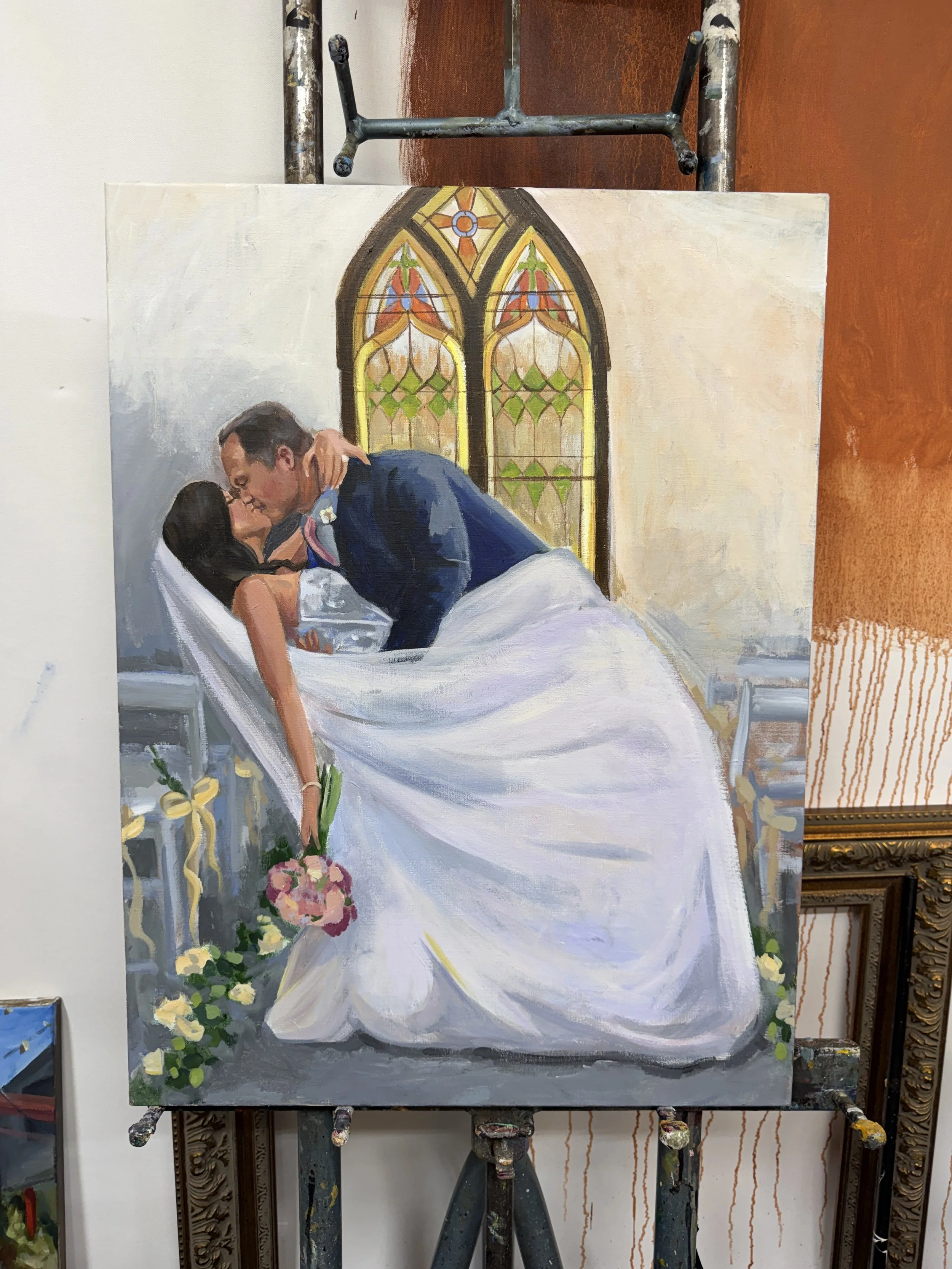8-10 hours of live painting on site + design consultation + minimum 10-15 hours studio finishing in oil paint. Extra time allows for me to spend time on details outside of the lights and activity of the reception. Oil paint stands the test of time, and allows me to touch up every detail from your smiles to the lace and folds of your wedding dress. Background and setting will be fully finished and detailed.